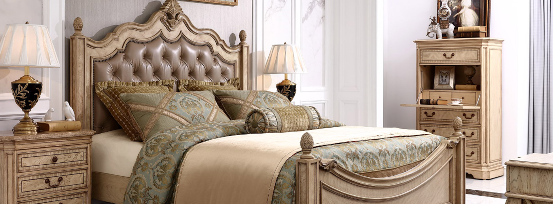 以巴黎的唯美愛(ài)情故事為背景,使用旋渦狀床板設(shè)計(jì),加上高檔的水曲柳樹(shù)瘤和白橡木皮,再用優(yōu)雅白配色與帶仿古效果的色澤痕跡點(diǎn)綴,并飾以低調(diào)舒適的進(jìn)口牛皮面料,充分彰顯了古典奢華與現(xiàn)代美學(xué)的結(jié)合,精彩演繹了法國(guó)人對(duì)奢華絢麗的寵愛(ài)。